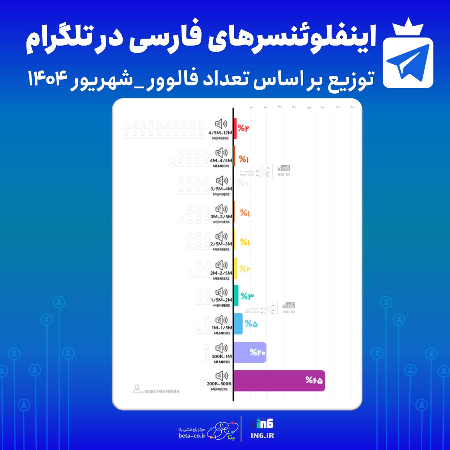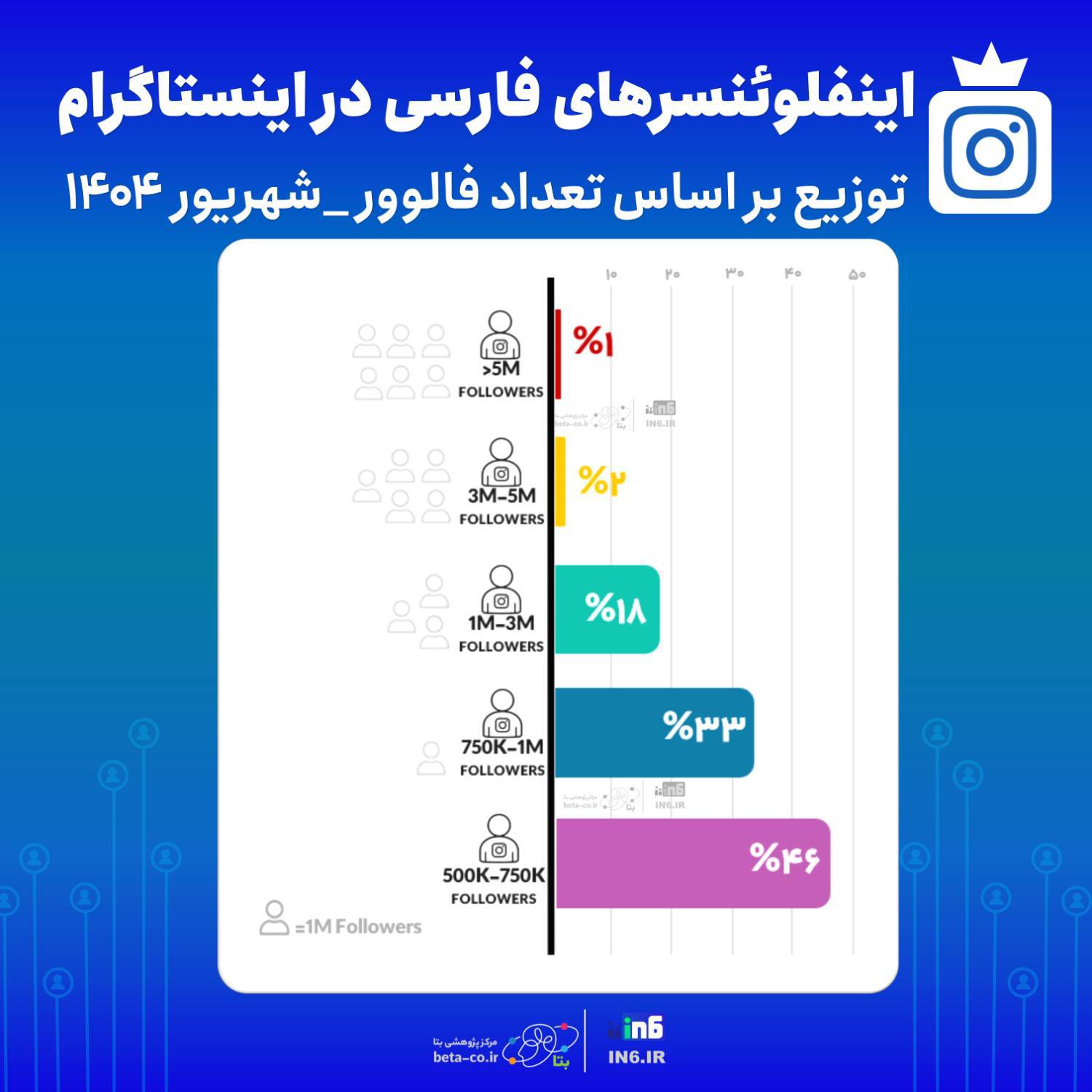 📅 شهریور۱۴۰۴ مرکز پژوهشی بتا به همراه in6.ir به بررسی تعداد کاربران در هر طیف فالوور اینستاگرام فارسی زبان پرداخته شده است. برآورد ها نشان می دهد بیش از ده هزار اینفلوئنسر با بیش از ۵۰۰هزار دنبال کننده فارسی فعال هستند. ۱⃣ بیش از۵میلیون فالوور:۱درصد اینفلوئنسر با بیش ۵۰۰هزار دنبال کننده در این رده قرار دارند. این ابراینفلوئنسرها شهرتی فراتر از فضای مجازی دارند، مانند چهره های سینمایی، ورزشی یا سلبریتی ها منابع خبری هستند.