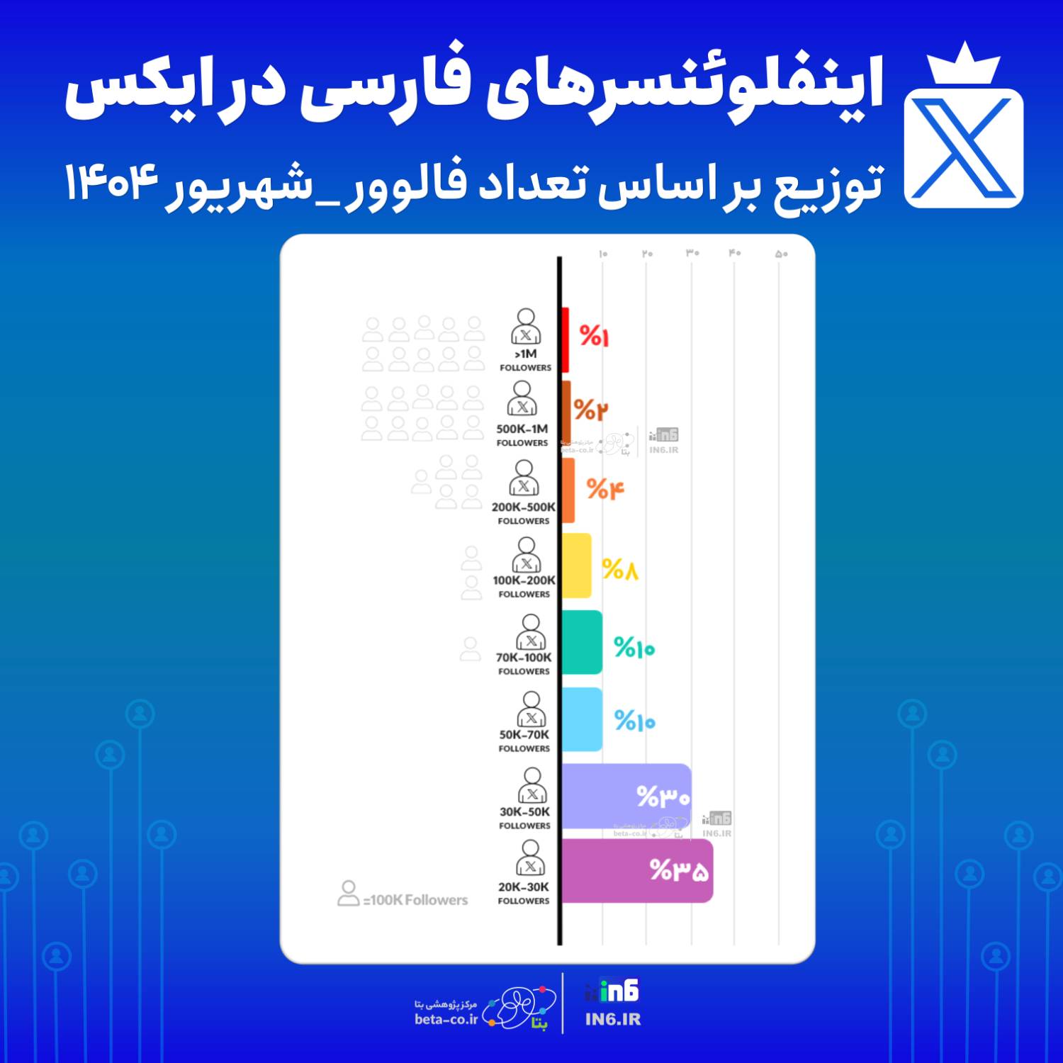 📌 #مرکز_پژوهشی_بتا با همکاری پلتفرم IN6.ir با انتشار گزارشی در شهریور ۱۴۰۴ کرد که بر اساس آن ایکس فارسی جامعه ای گسترده دارد، اما در لایه های میانی متمرکز است. 📌این توزیع نشان می دهد که اکثریت فعالان ایکس فارسی در سطح «اینفلوئنسرهای میان رده» قرار دارند . آنها معمولاً محتوای تخصصی تولید میکنند، جامعه ای وفادار دارند و سطح تعامل بالایی ایجاد می کنند. به عبارتی، ایکس بیش از آنکه محل ستاره سازی به